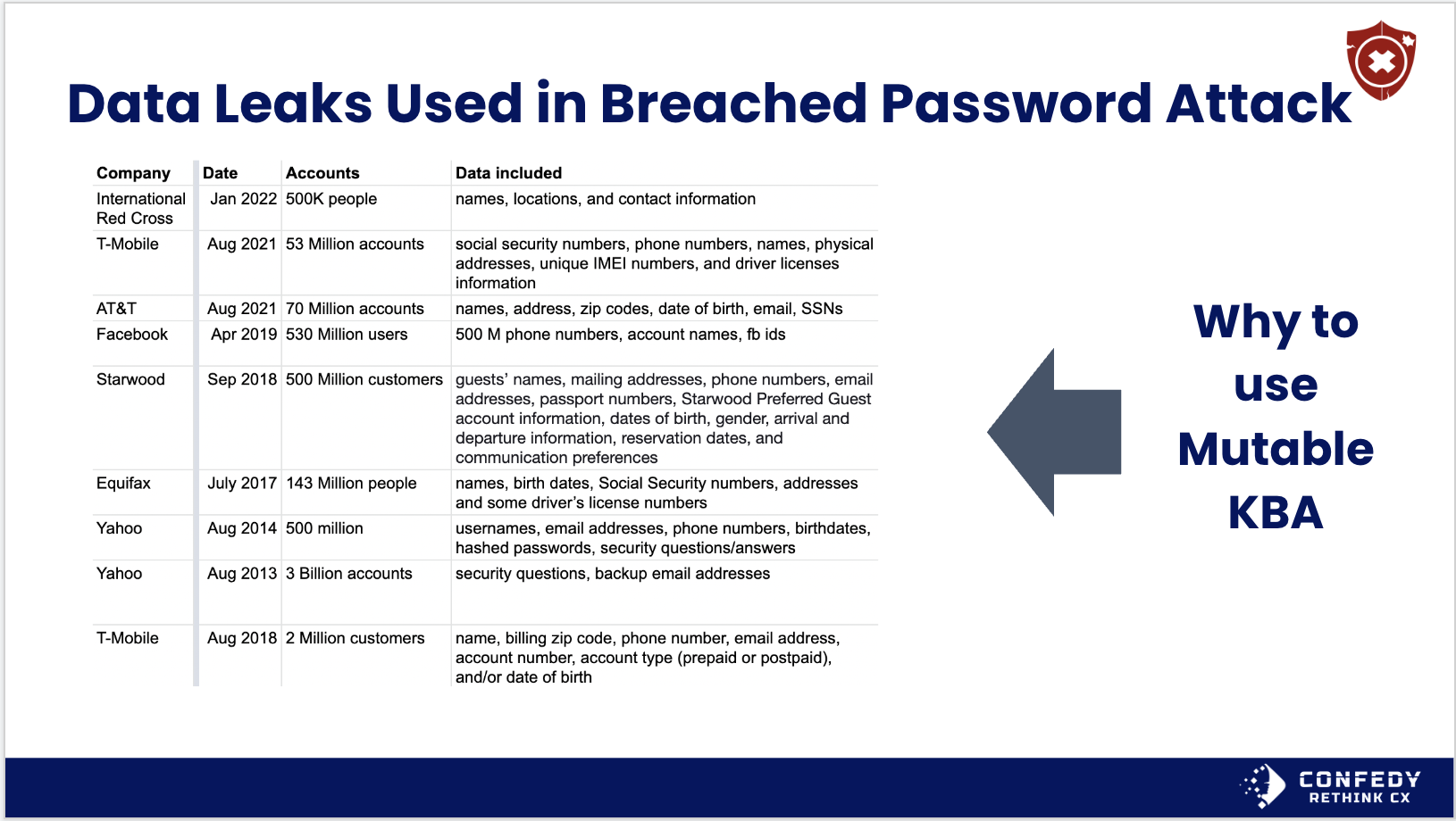 If you are going to rely on KBA, the best practice is to require datapoints that are private and mutable as shown in the table below. This includes long and secure PINs, unique secret questions, physically mailed access codes or support codes the customer can only get once they are logged into their online account.