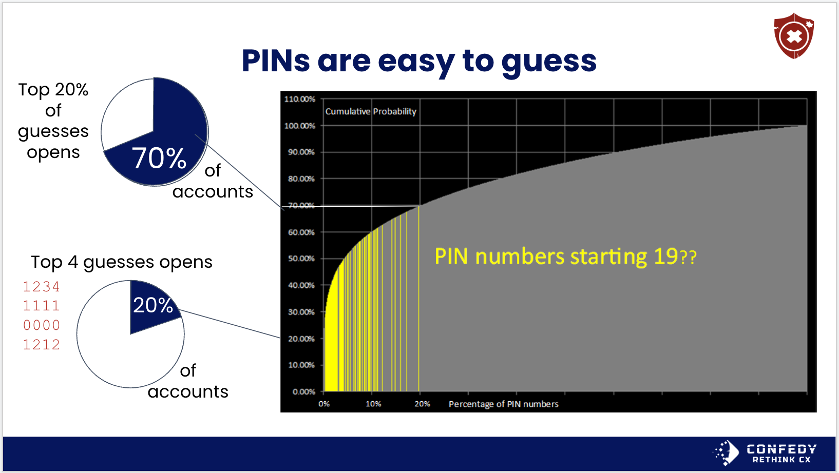 The same goes for phone PINs. These are usually 4 digit codes that customers create to access their account or prove their identity over the phone or other device (ATM). PINs should be 6 digits or more in length, and disallow the most common codes (e.g. 1234), and especially pins that start with 19 or 20 for birth years.